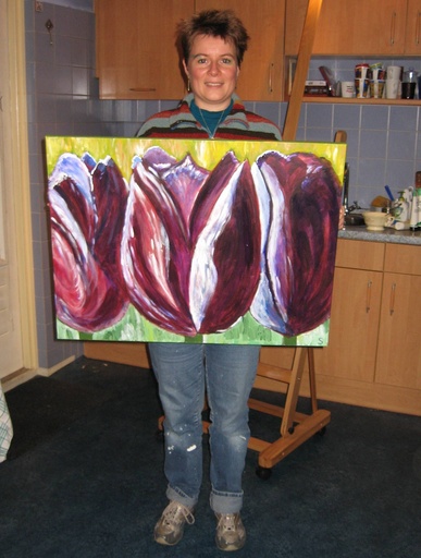 Ex-collega Saskia wilde al langer gaan schilderen, maar ze wilde wel een duwtje in de rug om daadwerkelijk aan de slag te gaan. Daarom vroeg ze me om samen een schilderij te maken, naar haar eigen smaak en zin. Vreselijk leuk om te doen. Uitdagend voor ons allebei en het resultaat mag er zijn (Saskia's tulpen, december 2006).